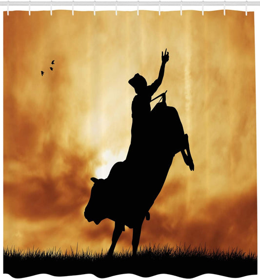 Western Shower Curtain, Bull Rider Silhouette at Sunset Dramatic Sky Rural Countryside Landscape ...