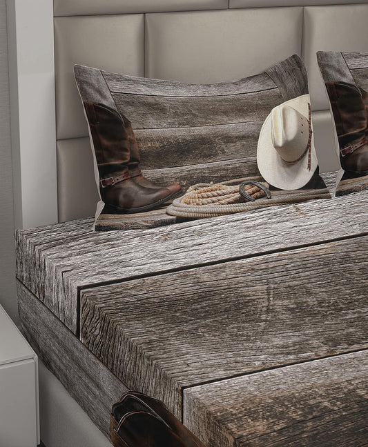 Western Sheet Set, American West Rodeo Traditional Straw Cowboy Hat Leather Boots Print, Fitted a...