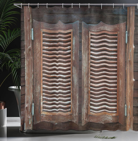 Western Shower Curtain, Antique Themed Traditional Rustic Wild West Swinging Wooden Cowboy Bar Sa...