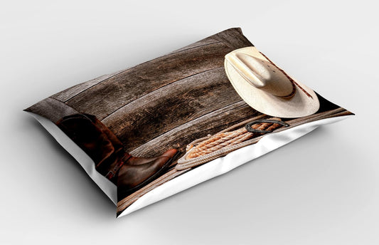 Western Pillow Sham, American West Rodeo Traditional Straw Cowboy Hat Leather Boots Print, Decora...