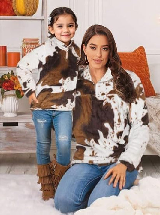 Womens plus Size Long Sleeve Casual Zip Collar Cow Print Fleece Jacket Tops