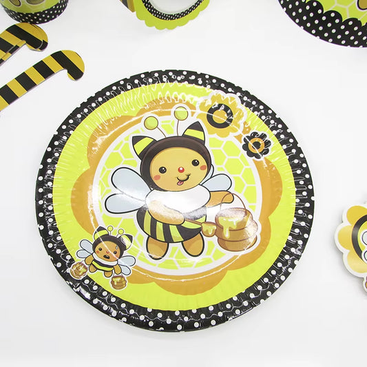 6Pcs Cartoon Bumble Bee Party Disposable Tableware Cups Plates Hats Straw Birthday Party Decorati...