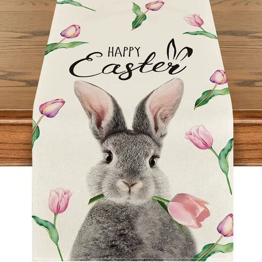 Easter Rabbit Colorful Eggs Flowers Green Plaid Linen Table Runners Washable Kitchen Dining Table...