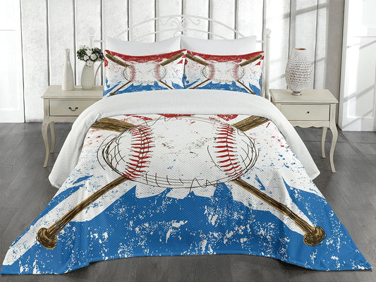 Sports Coverlet Set Queen Size, Hand Drawn Baseball Bats and Ball on Grunge Colored Background, 3...