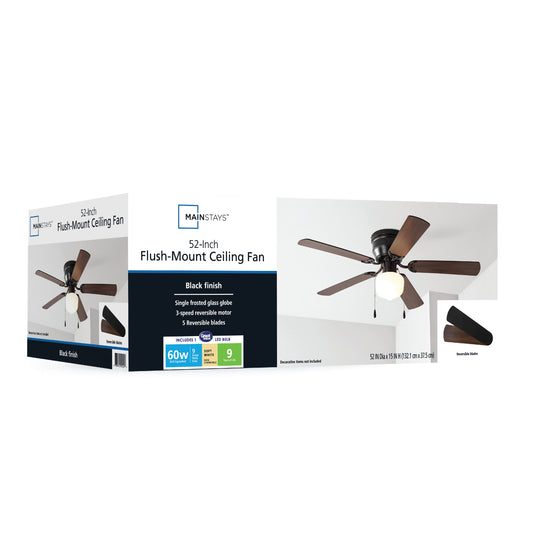 52 Inch Hugger Indoor Ceiling Fan with Light Kit, Black, 5 Blades,, Reverse Airflow