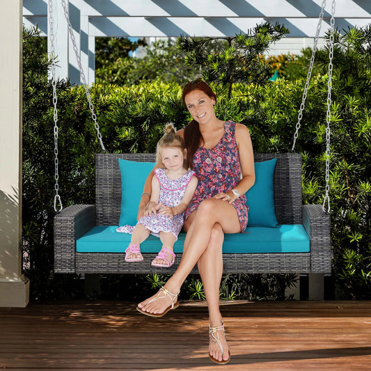 Fashion 2-Person Patio Hanging Porch Swing Rattan 800LBS Swing Bench W/ Turquoise Cushions