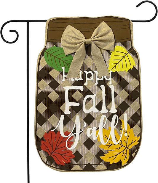 Fall Mason Jar Burlap Garden Flag Happy Fall Y'All 12.5" X 18"