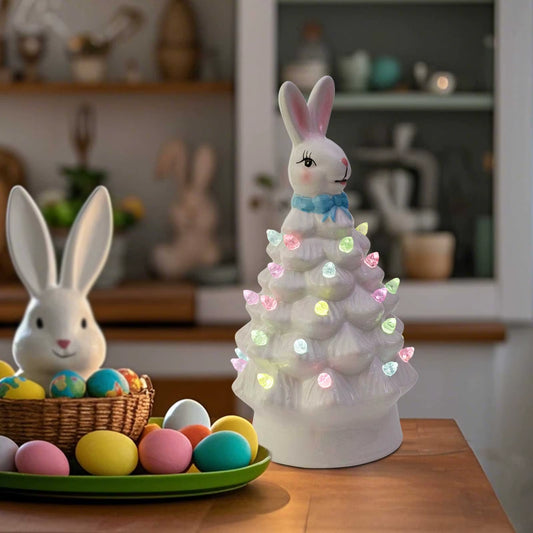 Ceramic Easter Bunny Tree Decoration with LED Lights Holiday Collectible Figurines Fireplace Tabl...