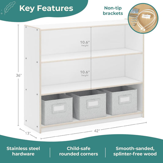 Edq Three Shelf Open Storage White with 3 Fabric Bins: Wood Bookshelf and Toy Organizer for Kids ...