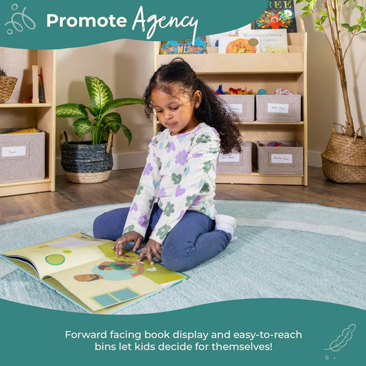 Edq Book and Bin Browser Natural: 6 Fabric Storage Bins, Book Display and Toy Storage Organizer f...