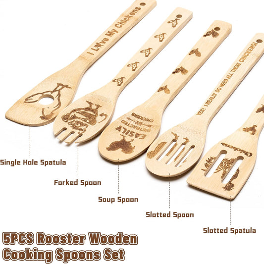 5Pcs Rooster Chicken Wooden Spoons Utensils Set Non-Stick Cooking Carve Burned
