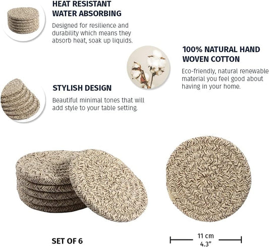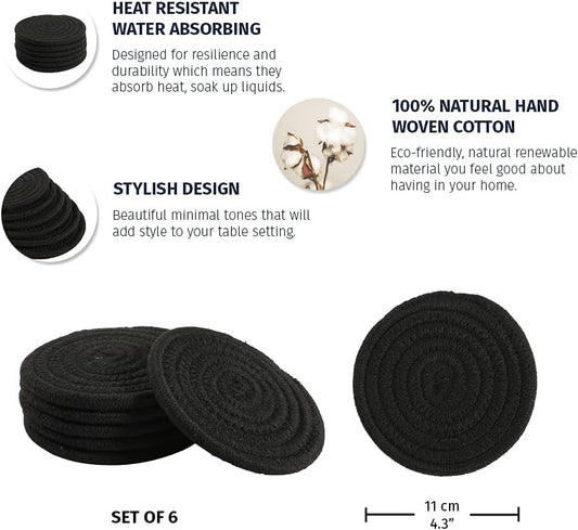 Set of 6 Black Coasters 4.3", Farmhouse Woven Coasters for Coffee Table, Absorbent Coasters ...