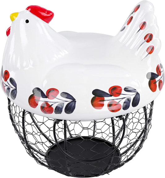 Chicken Egg Basket in Navy and Red Design Ceramic Chicken Shaped Lid with round Wire Basket Base ...