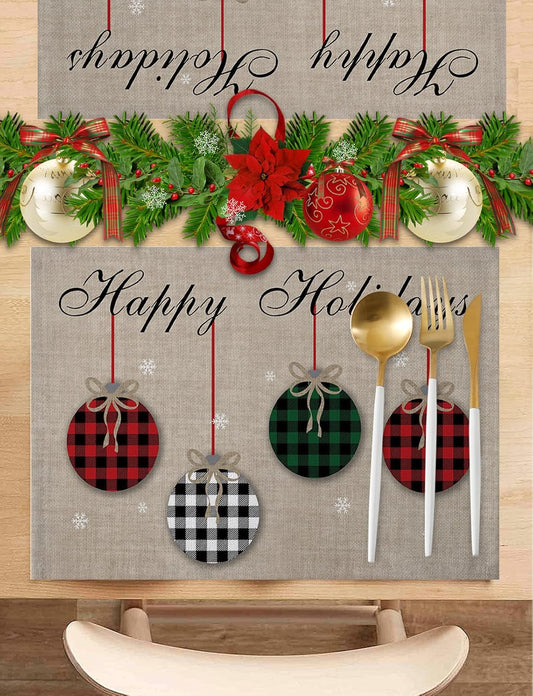 Christmas Theme Placemats Set of 6, Farmhouse Rustic Ornaments Plaid Balls Cotton Line Stain Resi...