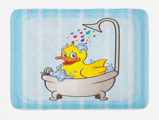 Duck Bath Mat, Cartoon Character Taking a Bath Colorful Drops Backdrop Dots, Plush Bathroom Decor...