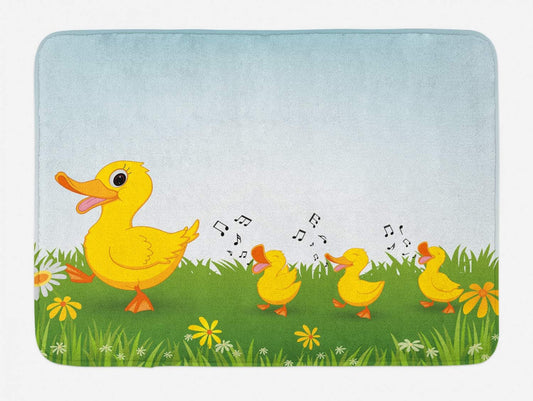 Cartoon Bath Mat, Mother Duck Walking and Singing on the Meadow Flowers, Plush Bathroom Decor Mat...