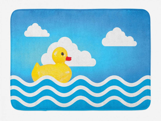 Rubber Duck Bath Mat, Yellow Childrens Toy on Wavy Water Inspired Stripes Clouds, Plush Bathroom ...