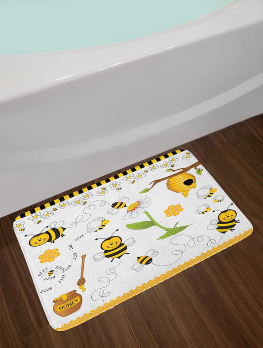 Collage Bath Mat, Flying Bees Daisies Honey Chamomile Flowers Springtime Animal Print, Plush Bath...
