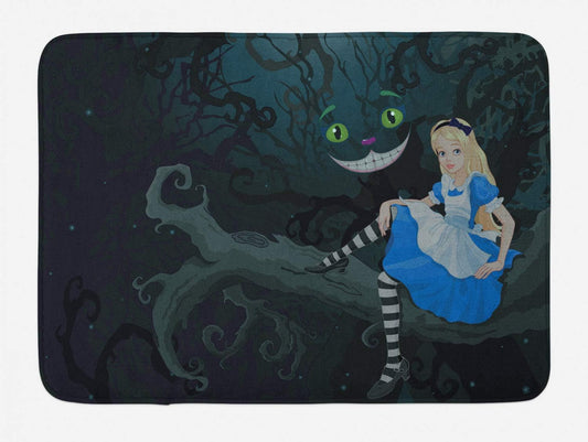 Alice in Wonderland Bath Mat, Alice Sitting on Branch and Chescire Cat in Darkness Cartoon Style,...
