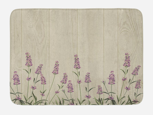 Lavender Bath Mat, Aromatic Herbs on Wooden Planks Springtime Nature Botany Illustration, Plush B...