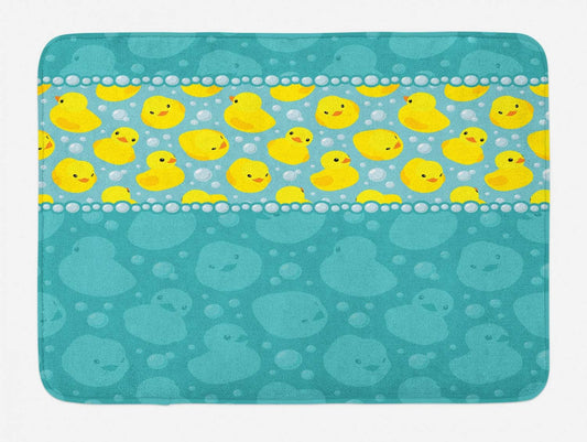 Rubber Duck Bath Mat, Cartoon Style Duckies Swimming in Water Pattern Fun Bubbles Aqua Colors, Pl...