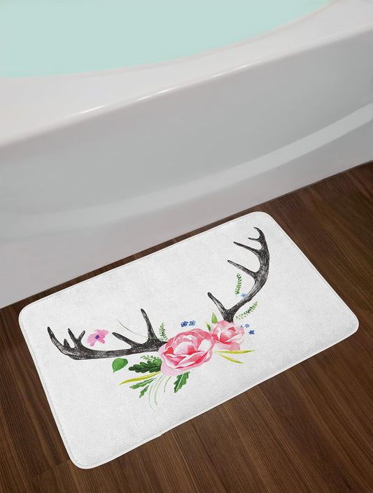Antler Bath Mat, Black Deer Horns Pink Roses Floral Wreath Design in Watercolors Wildlife Art, Pl...