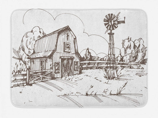 Windmill Bath Mat, Rustic Barn Farmhouse Hand Drawn Illustration Countryside Rural Meadow, Plush ...