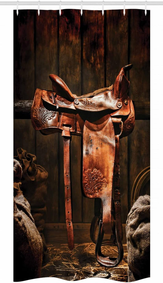 Western Stall Shower Curtain, American West Traditional Style Rodeo Cowboy Saddle Wood Ranch Barn...