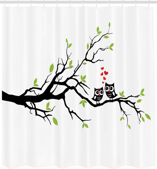 Owls Shower Curtain, Owls in Love Sitting on a Branch Leaf Leaves Hearts Romance Themed Artwork, ...