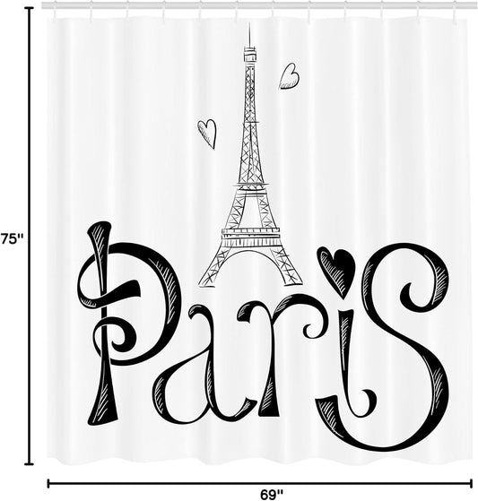 Paris Shower Curtain, Illustration with Eiffel Tower France Heart Shapes Silhouette Vacation Them...