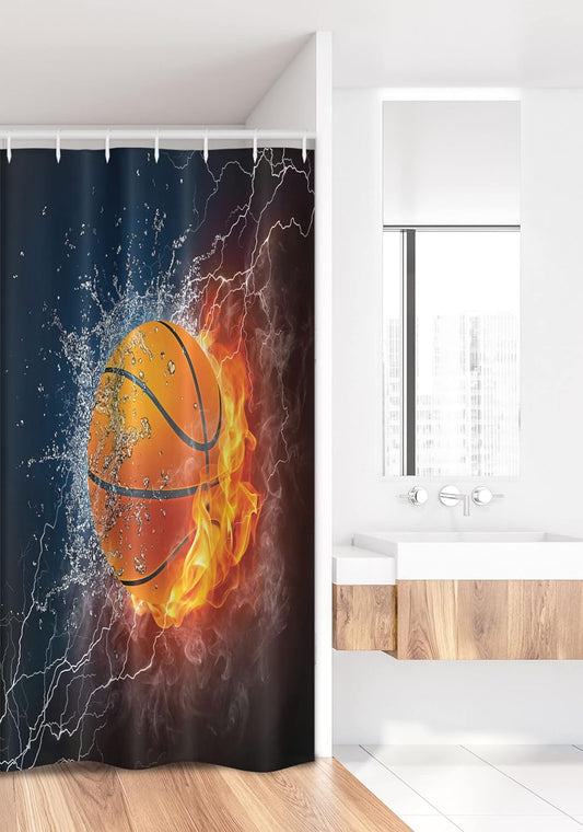 Sports Stall Shower Curtain, Basketball Ball and Water Splashing Thunder Lightning Themed Design,...