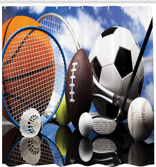 Sports Shower Curtain, Sports Equipment Football Soccer Darts Ice Hockey Baseball Basketball Them...