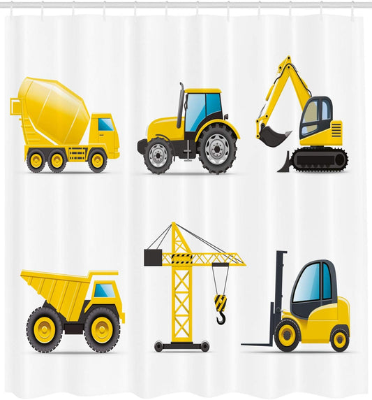 Cartoon Shower Curtain, Style Heavy Machinery Truck Crane Digger Mixer Tractor Construction, Clot...