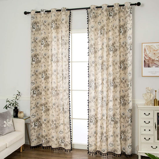 Cotton Linen Floral Window Curtain with Tassels Farmhouse Room Darkening Grommet Curtains for Bed...