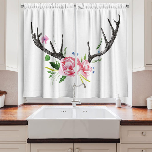 Antler Kitchen Curtains, Black Deer Horns with Pink Roses Floral Wreath Design in Watercolors Wil...