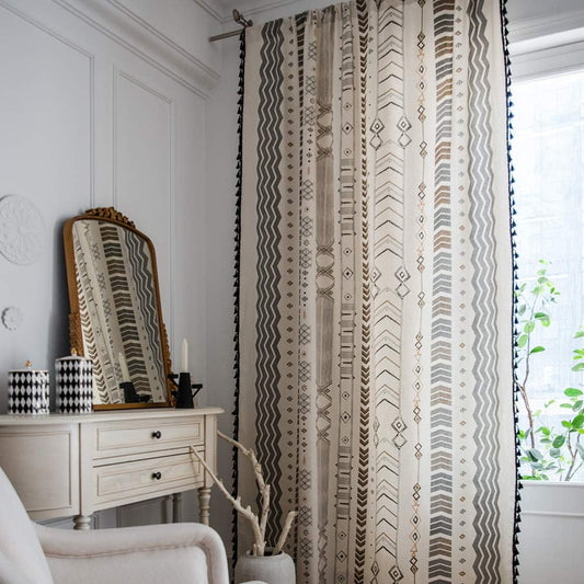 Boho Curtains 2 Panels Geometric Light Filtering Semi-Blackout Window Cotton Linen Patterned West...