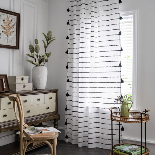 Geometric Striped Semi-Blackout Window Curtains for Living Room Boho Cotton Linen Darkening Curta...