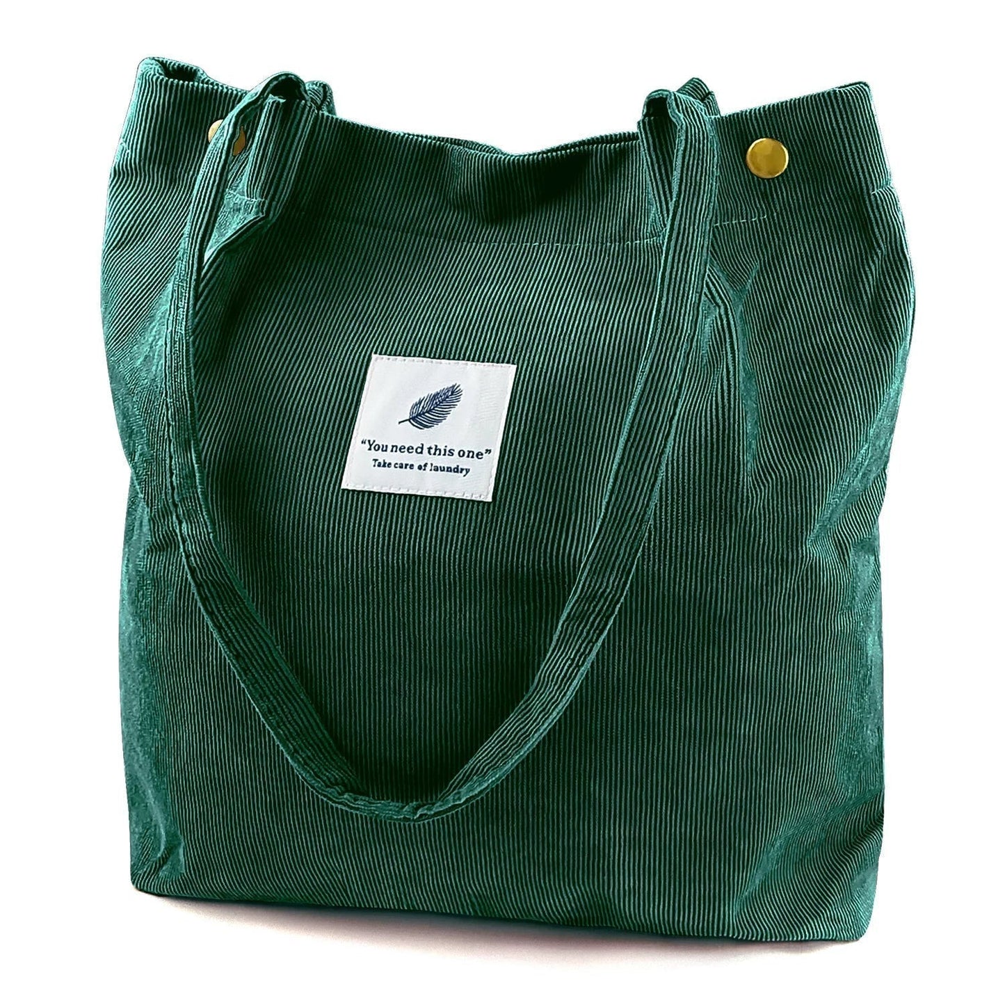 Corduroy Tote Bag Large for Women Girl Lady Canvas Shoulder Cord Purse and Handbags with Inner Pocket (Green)