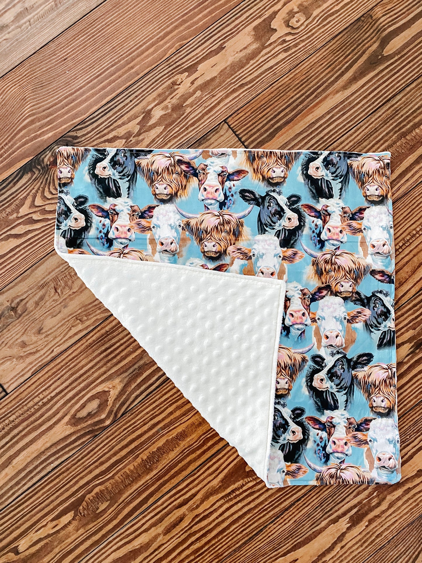 A cow print with a mix of cows, cattle and highlands on a soft cotton with an ivory minky backing.