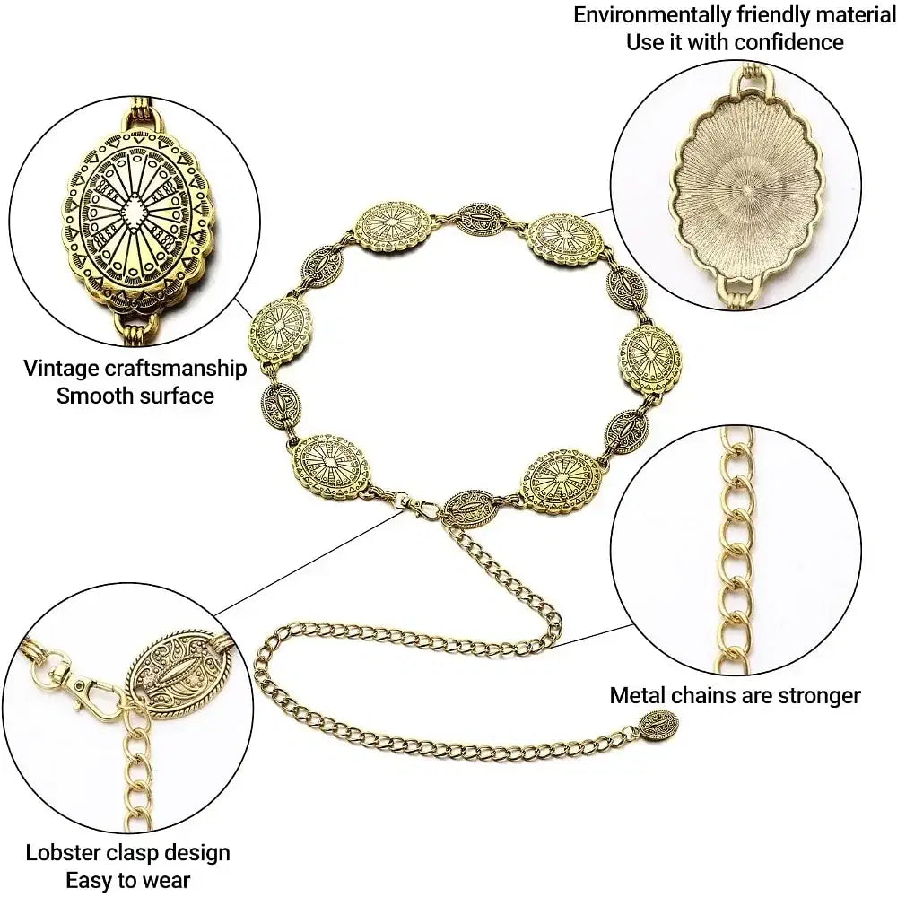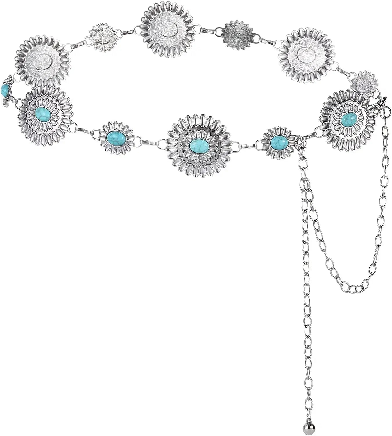 Ovida Metal Chain Belt for Women Cowgirl Western Country Chain Belts Adjustable Concho Belt for Sweaters Dresses Jeans