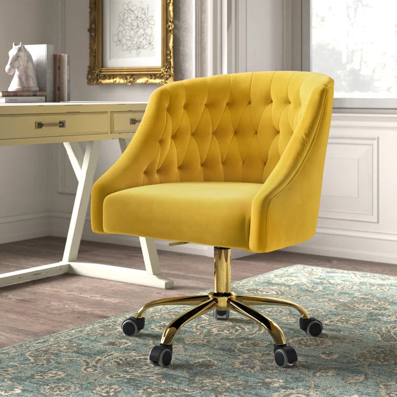 This task chair combines style and comfort with its barrel silhouette and button-tufted velvet upholstery. Made from solid and engineered wood, its frame sits on a gold-finished base with double-wheel casters for easy movement on tile, hardwood, or concrete floors. With adjustable height and swivel capabilities, it's designed to be used for hours on end, making it a great choice for your home office. The fixed armrests provide added support, while the foam-filled seat and back ensure a comfortable seating experience. Hand-curated by Kelly Clarkson.