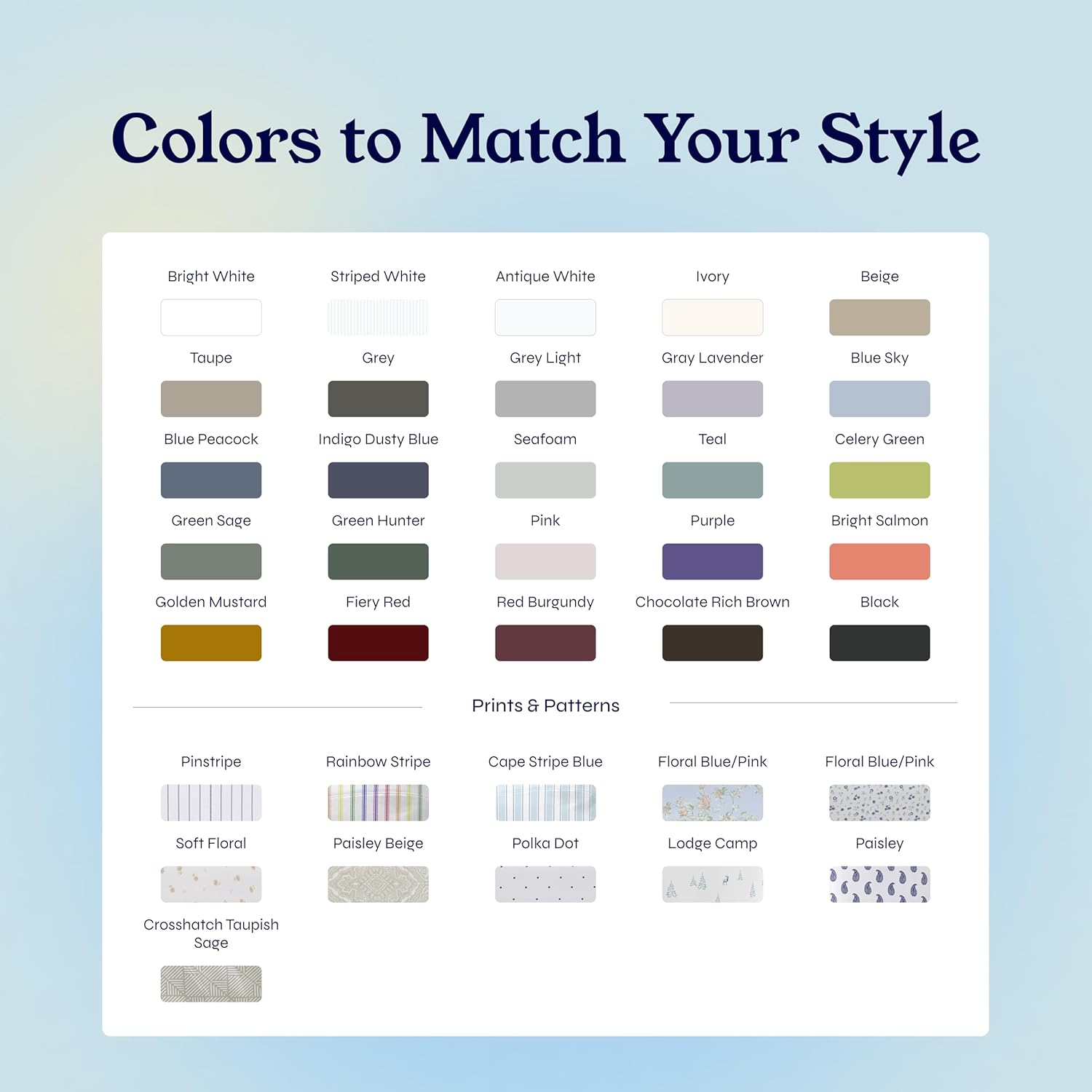 | Color Range | 30+ Solid, Stripes, Prints | 5+ Solid Colors | 5+ Solid Colors | 15+ Solid Colors & Prints | 16+ Striped & Solid Colors | 6+ Solid Colors | 6+ Solid Colors |