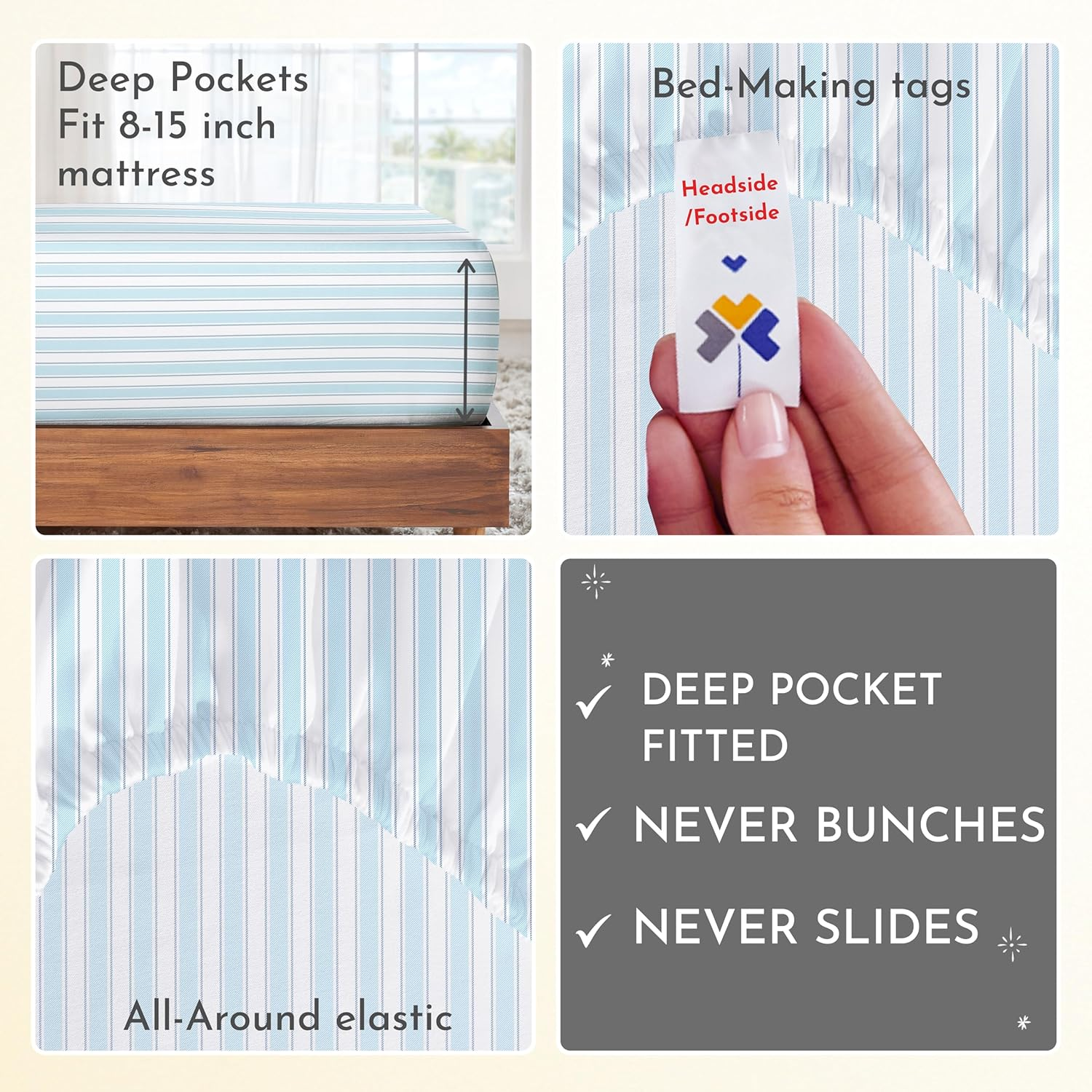- Fits Perfectly: Our 3-piece sheet sets are expertly crafted with quality stitching. The fitted sheet has 15-inch deep pockets, so it will fit mattresses from 8-15 inches deep. The strong elastic ensures that the sheets will not pop off or become loose over time. Our fitted sheet also feature a head/foot side indicator for a seamless bed making experience. For those looking for extra comfort and luxury, deep pocket sheets are the perfect choice.
