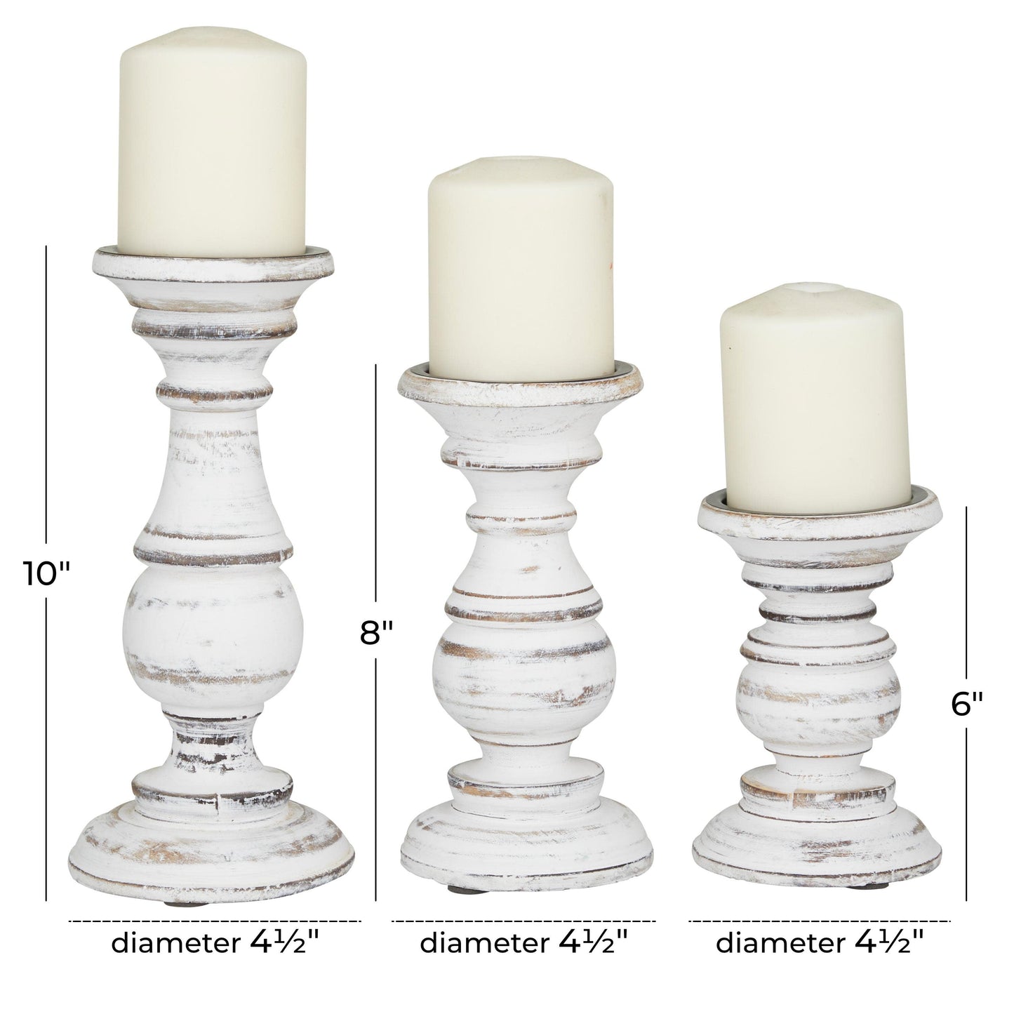 DecMode 3 Candle White Mango Wood Turned Style Pillar Candle Holder, Set of 3 is a unique addition to your stylish home. Give your space a radiant illumination with these beautifully crafted candle holders. Made with a sturdy base, it is perfect for creating an elegant atmosphere at your table top or mantel. Place this white set of 3 candle stands in your living room or dining area to elevate any occasion with its warm glow. Designed with felt or rubber stoppers at the base that prevent scratching furniture and table tops, as well as sliding around. Can hold 3 pillar candles, not included. This item ships in 1 carton. Mango wood candle holder makes a great gift for any occasion. Suitable for indoor use only. This item ships fully assembled in one piece. Made in India. This white colored mango wood candle stand comes as a set of 3. Traditional style.